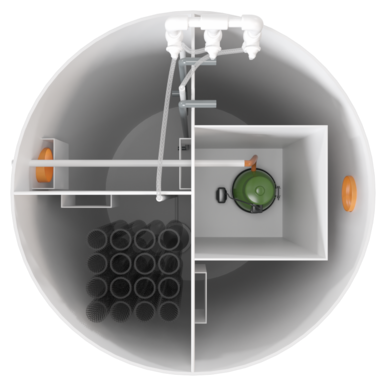 Камера отстойник из которой выходит очищенная вода самотечным или принудительным способом (насос) в дренажное поле, тут так же происходит удаление избытков активного ила, через эйрлифт перекачивая в приемную камеру